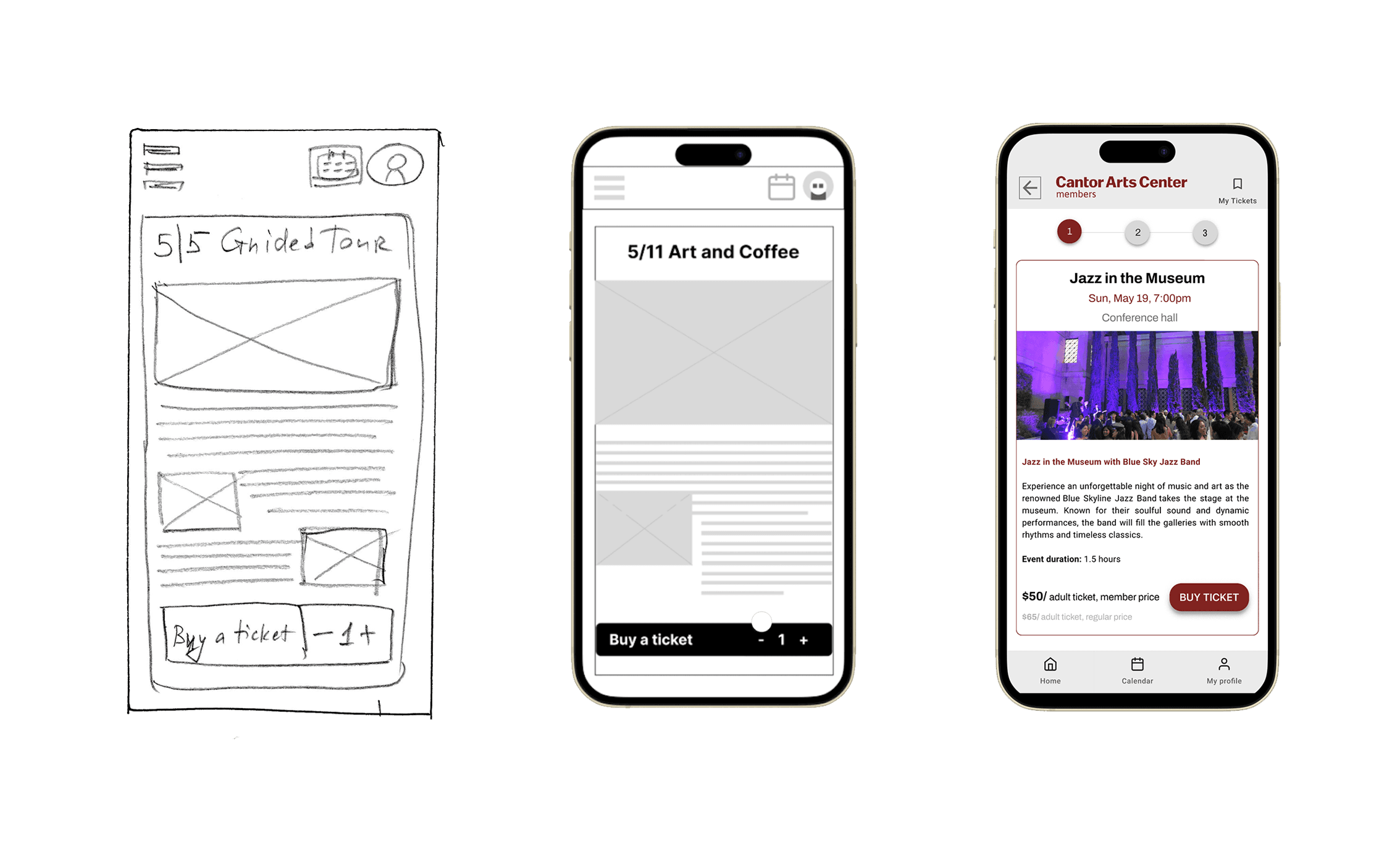The design process began with hand-drawn sketches exploring different home page approaches, then moved through lo-fi wireframes for structure, and culminated in a high-fidelity prototype using Cantor's existing Stanford brand identity.
